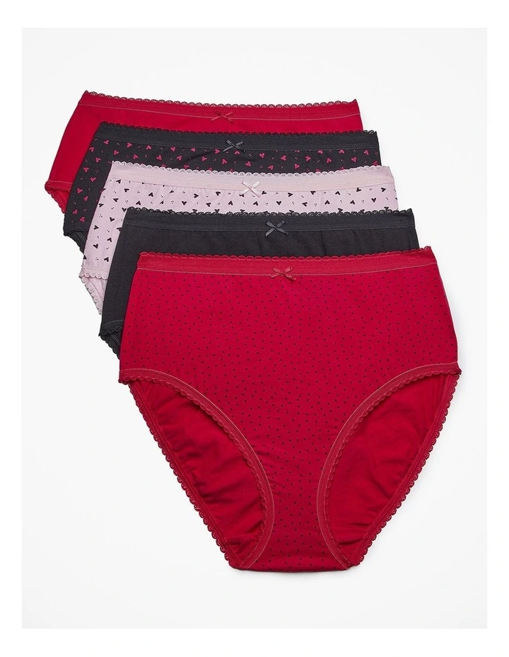 The 5 Pack Love Cotton Briefs add a touch of fun for everyday and beyond. All briefs are the same shape, and have a high waist and full back as well as a soft wide-leg opening – and come in an assortment of colors and lovely dots and heart print!