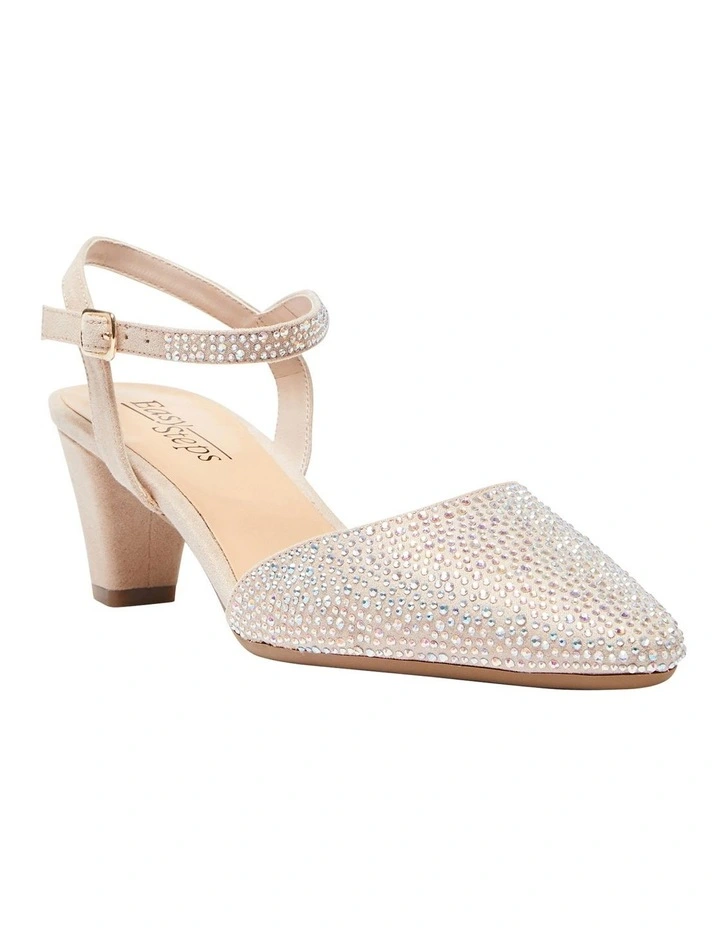 Find a seamless blend of sparkling comfort in the ADELLE Heel by Easy Steps. Decorated with miniature gems for modest glamour, it features a tapering block heel and slender adjustable ankle strap. Pair yours underneath cocktail dresses for a glittering evening look.