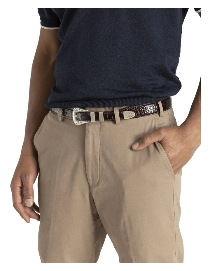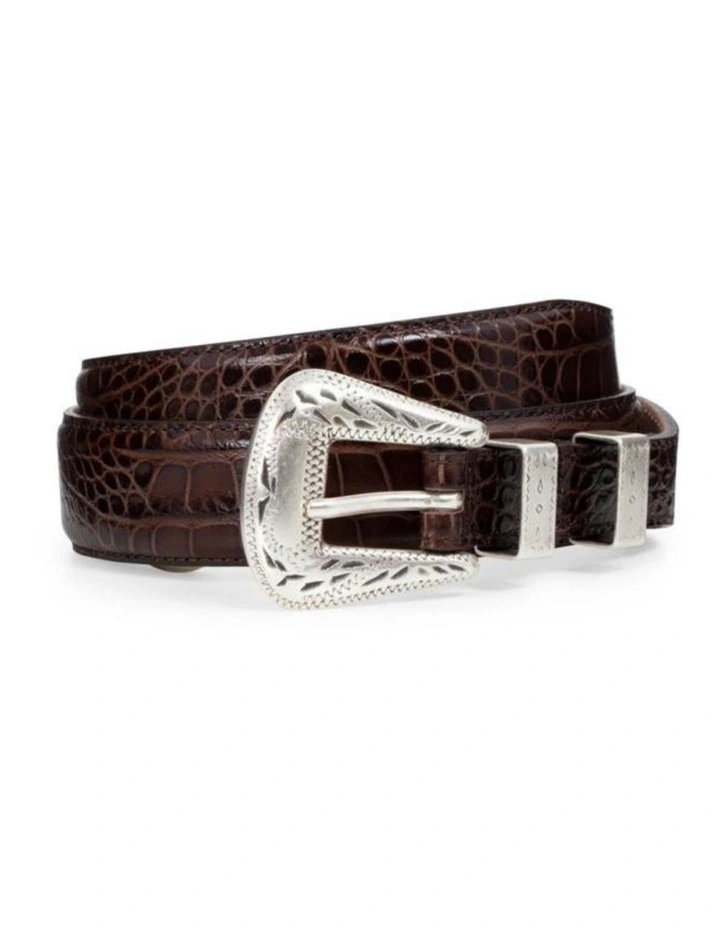 How better to complete any ensemble, tailored or casual, than by adding a dash of superb detail. Proudly handcrafted in Italy from printed crocodile, this belt holds an English silver-plated solid brass buckle and a full-grain Nabuk lining.