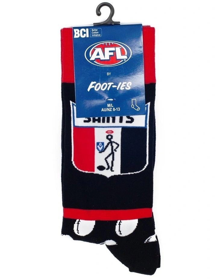 Show your St Kilda Saints team colours every day of the week in these officially licensed AFL x Foot-ies socks. Foot-ies use a premium blend of cotton, polyamide and elastane fabrication with a market leading 200 needle construction. This ensures they maintain their comfort, fit and colour and also allows for detailed graphics of your favourite team! This sock is a mid rise crew sock with comfort heal gusset to ensure the perfect fit. Australian owned and designed in Melbourne. Warm machine wash for best results to keep your AFL team colours vibrant!