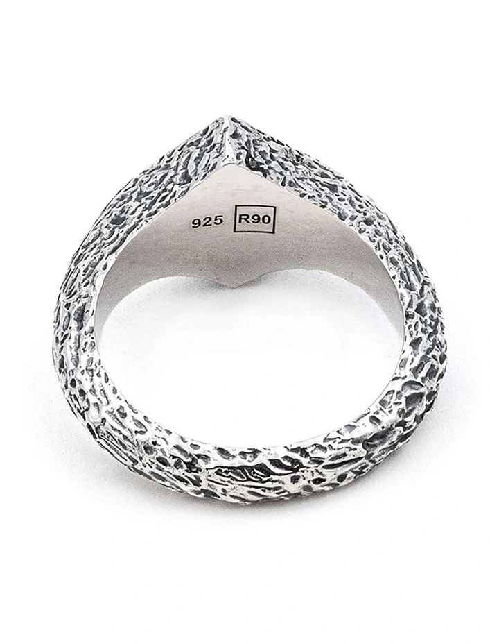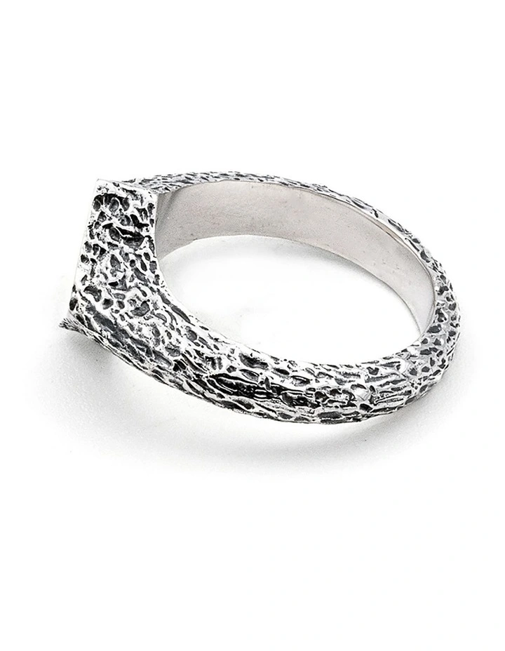 Rugged meets refined with contrasting polished face and fossilised detailing. Promising recognisable surface interest with dramatic variances in 925 sterling silver, this heirloom piece is perfect for wear on its own or styled with the Andreas 1.0 and Andreas Stack Ring.