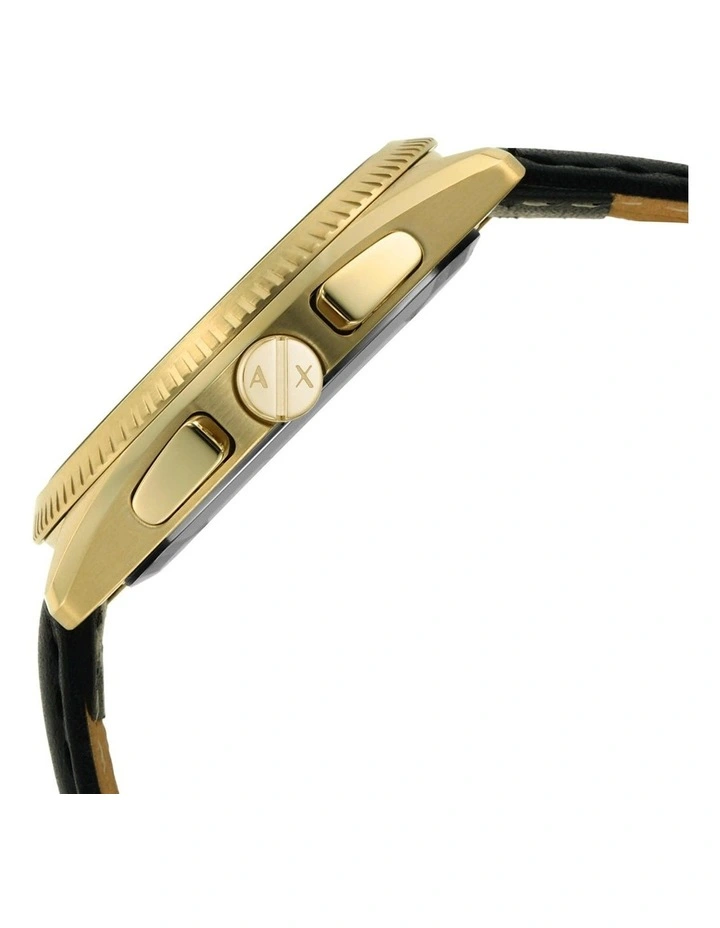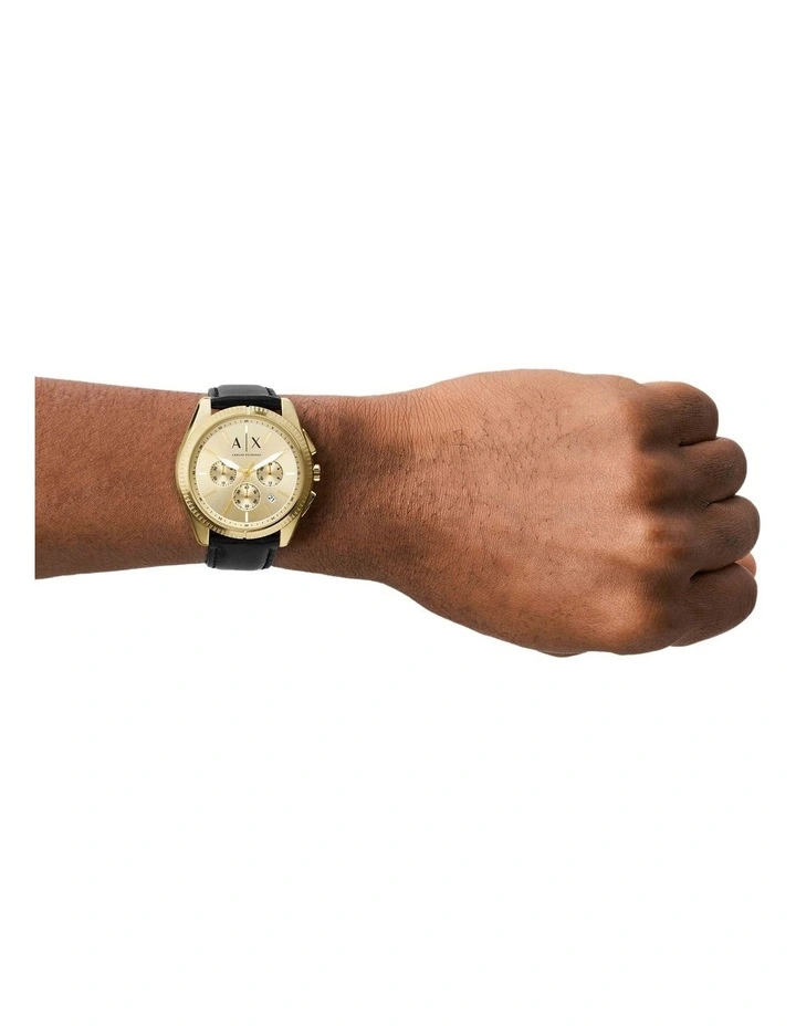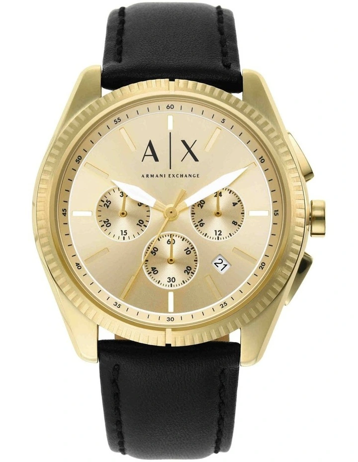 Armani Exchange’s 43mm watch features an at least 50% recycled stainless steel case, sunray gold dial, chronograph movement and black strap with leather sourced from LWG Certified tannery.