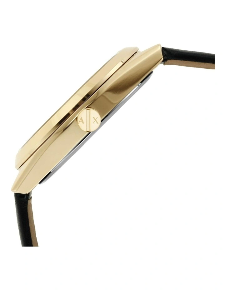 Armani Exchange’s 38mm watch features at least 50% recycled stainless steel case, sunray gold dial, multifunction movement and black strap with leather sourced from LWG Certified tannery.