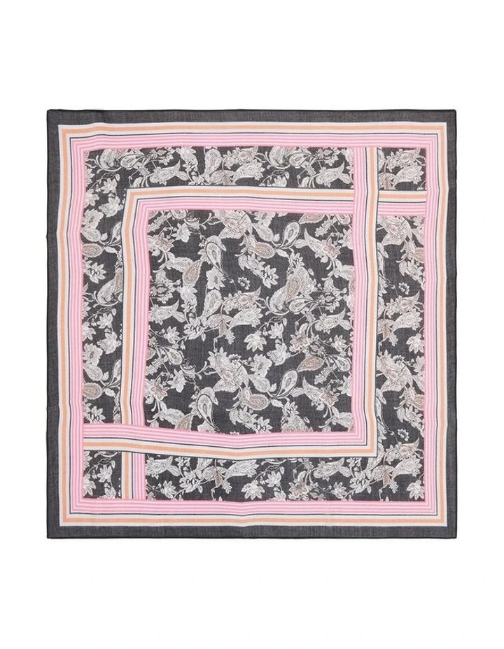 Flowing through super soft modal, this scarf not only feels gorgeous against the skin, it also looks beautiful as it showcases an exclusive David Lawrence print. Measuring 90cm by 90cm, the scarf is square in shape, showing off intricate black and white print detailing at the centre, bordered by a pink and peach stripe.