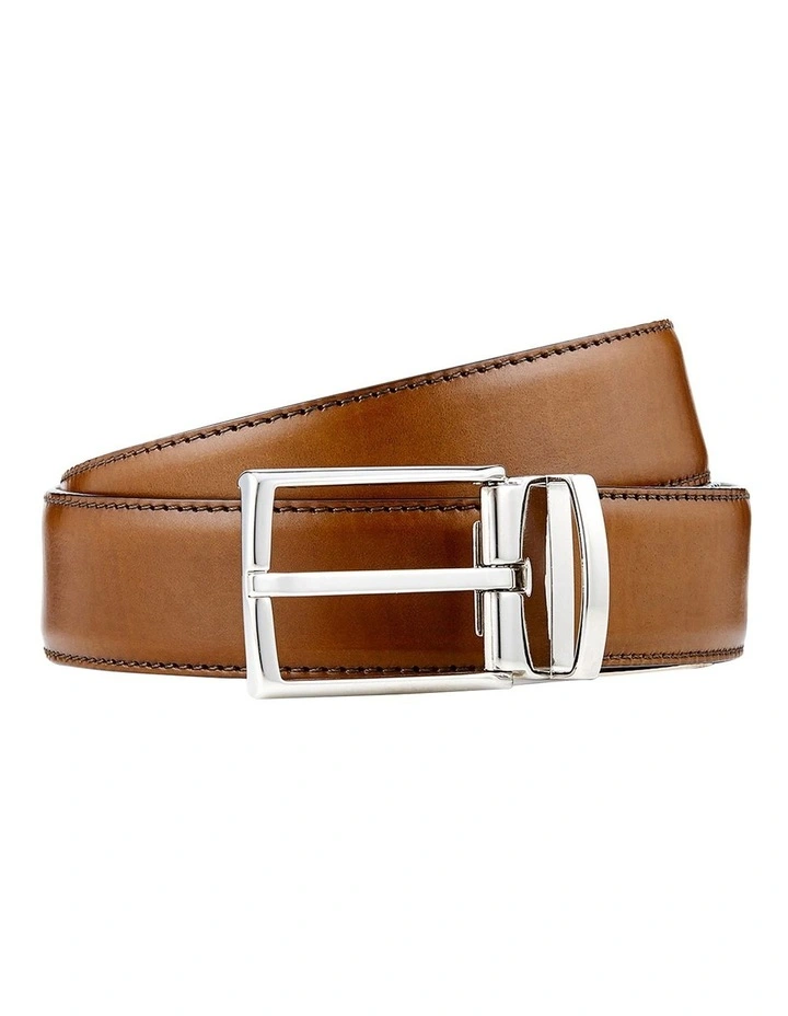 Made in Italy and styled with dark burnished edging and a soft worn feel, the Bane features a square silver finish buckle, adjustable to any length.