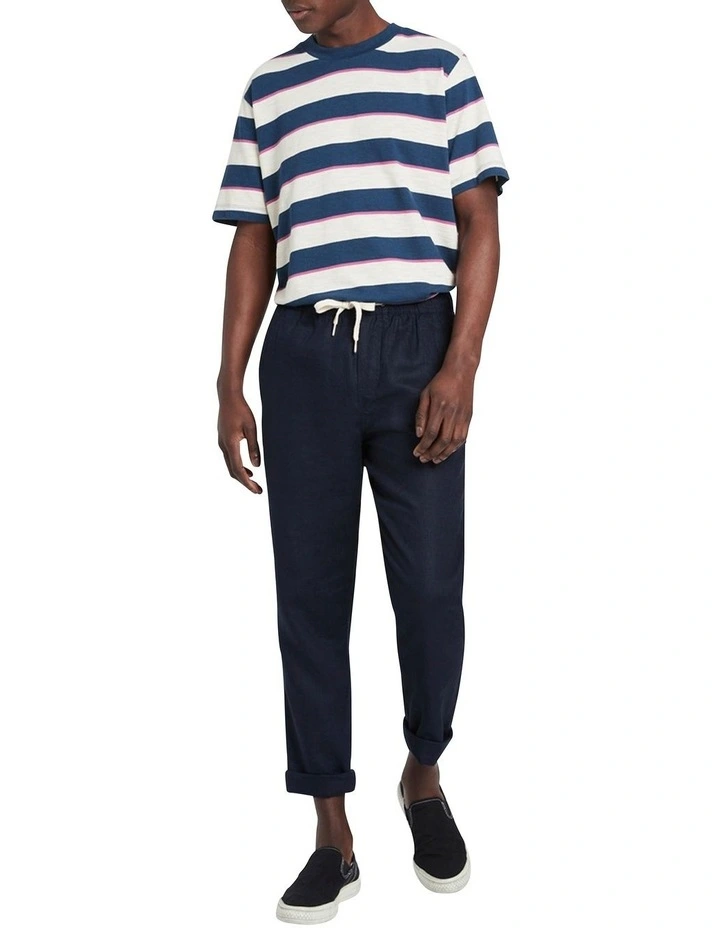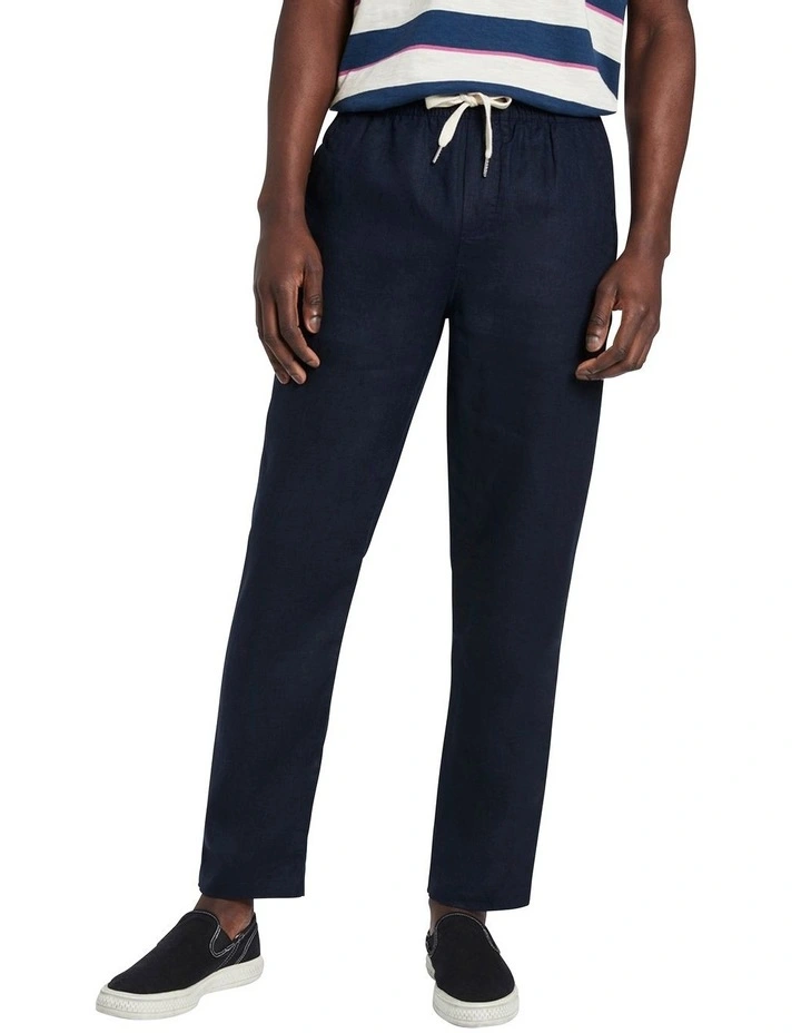 Delivering relaxed, casual shaping, these navy pants create an easy neutral, made from soft, breathable linen that will keep its cool, even as temps rise. Featuring a comfortable elasticated waistband, the pants offer a pull-on style, with additional detail offered in a contrast drawstring tie at the waist, angled pockets at the hip, and button-down welt pockets at the back.