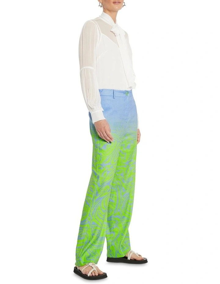 Dazzling in their print, these pants flow through a soft linen blend, to reveal relaxed, straight leg shaping that descends from a flattering high waist to full length. Creating an ombr effect that moves through blue to swirling neon green, the pants deliver additional detail in button-tabs at the waist, angled pockets at the hip, and a single welt pocket at the rear.