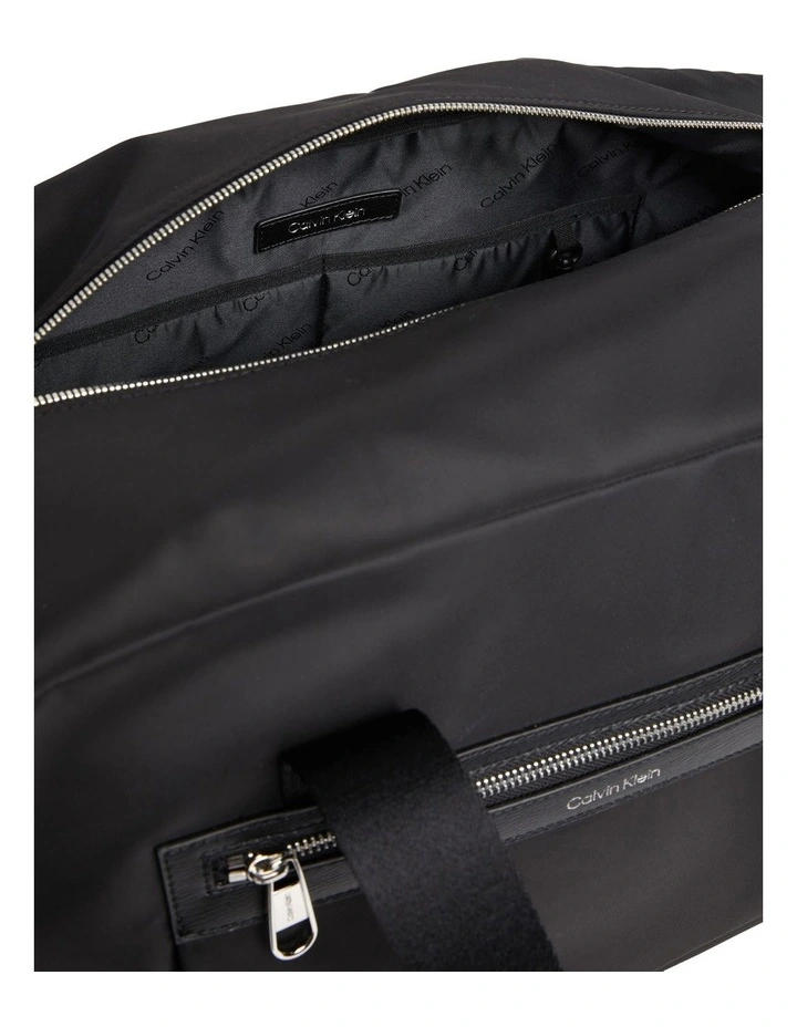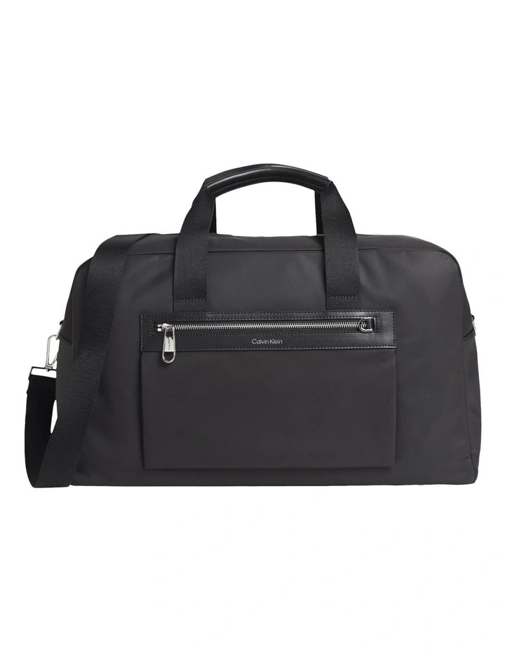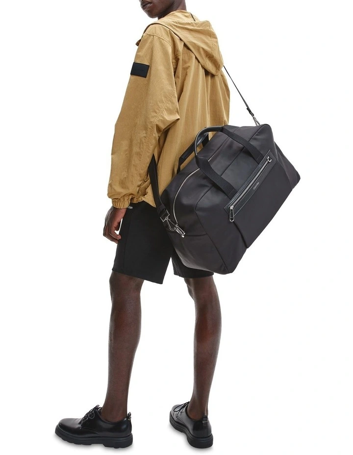 A roomy weekender bag cut from a recycled polyester fabrication. This bag has the option of a webbed shoulder strap.