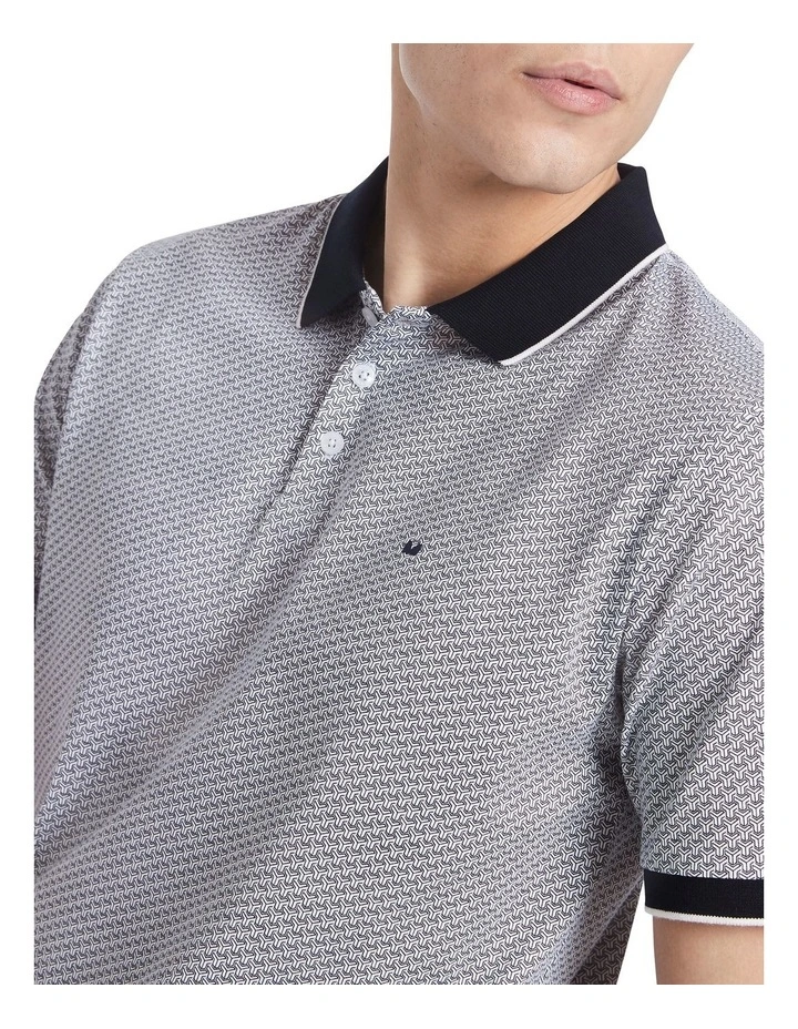 Soft and breathable in pure mercerised cotton, this polo shows off an intricate geometric print in navy and ivory, perfectly accentuated by white-tipped navy rib detailing at the soft collar and cuffs. Featuring a regular fit through the body and short sleeves, the tee is completed by a polo button closure at the neck, splits at the side seam, and an embroidered M logo at the chest.