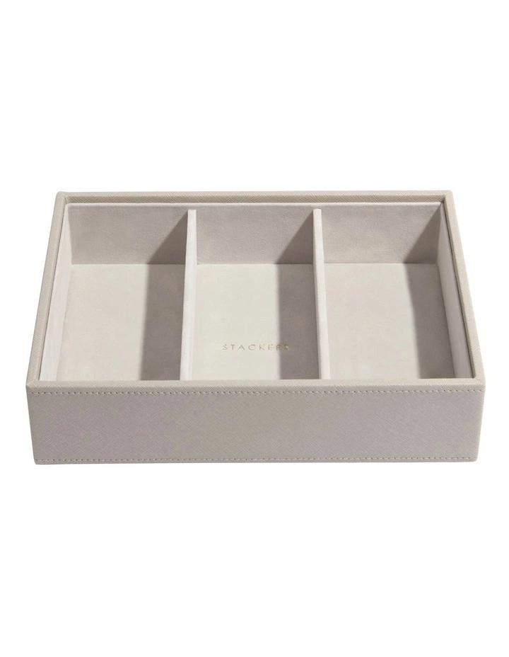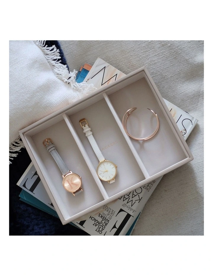 Stackers jewellery boxes are designed so you can create your own by choosing which layers and accessories best suit your unique collection. The Taupe Classic Watch/Accessories Layer is made with Vegan Leather & Velvet Ideal for your watches and bracelets. Tailor this even further with our watch/bracelet pad or add the ring roll holder for those statement rings. Size: 250x180x60mm