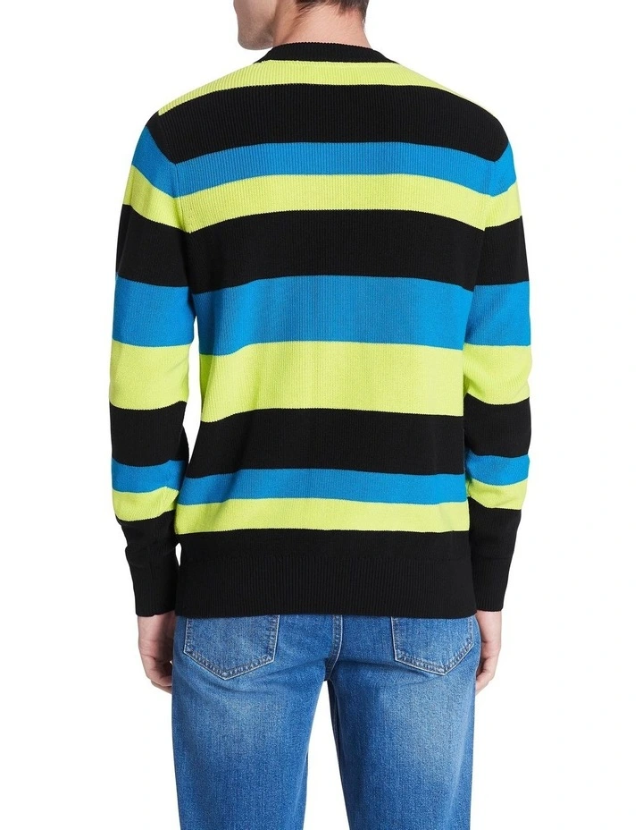 Bold in its colouring, this long sleeve knit sweater flaunts a vibrant horizontal stripe in shades of blue, lime green and black. Soft and breathable, the sweater is made from pure cotton yarn, which works to create a regular fit throughout, finished with solid black rib trim at the crew neckline, sleeve cuffs and body hem.