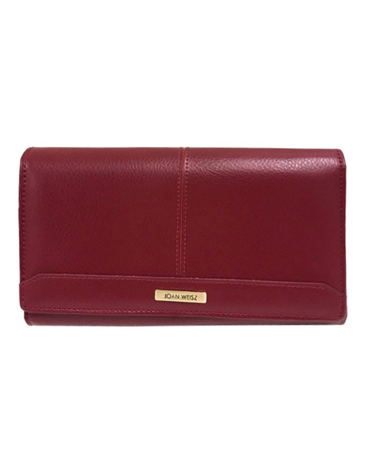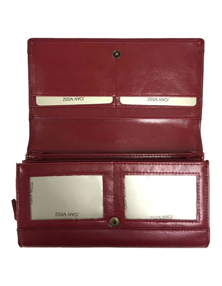 Joan Weisz Dakota Large wallet in Red. Brushed gold hardware. Front flap over with snap closure and back tab with snap closure. Internal with 16 credit card slots, 3 display windows, 4 slip pockets and 2 zip pockets. Fabrication Leather and Polyurethane lining. Dimensions: 19 W x 11 H x 3 D cm. Style JWF044