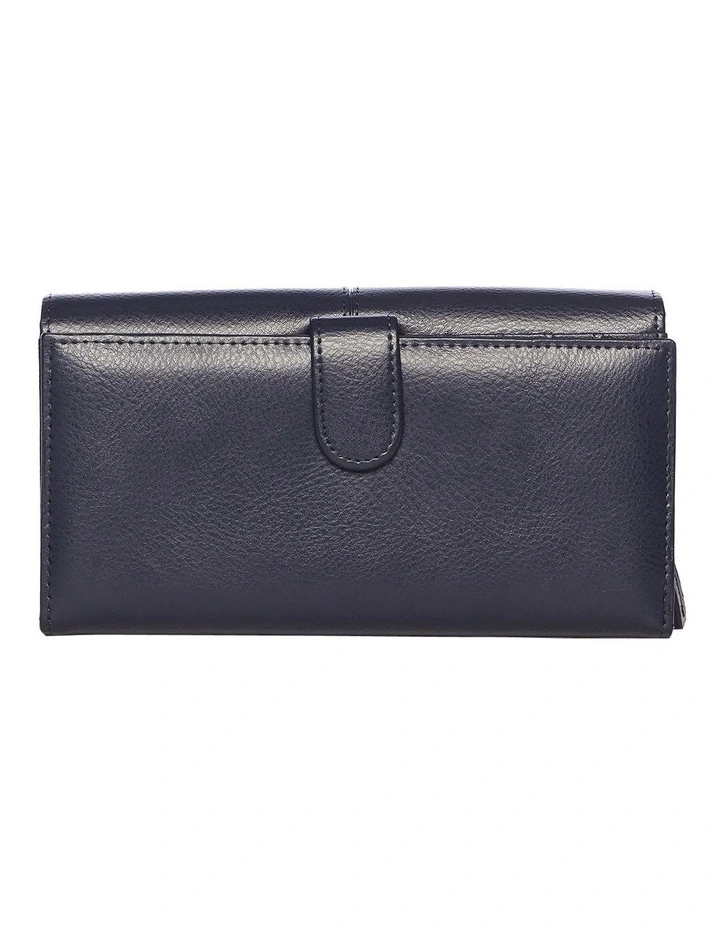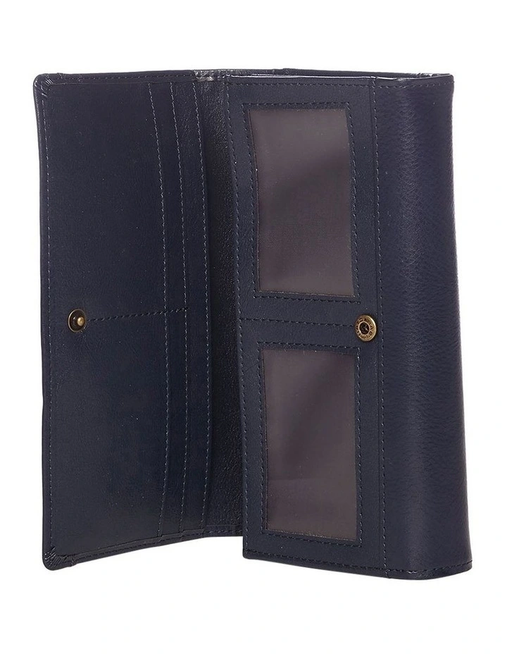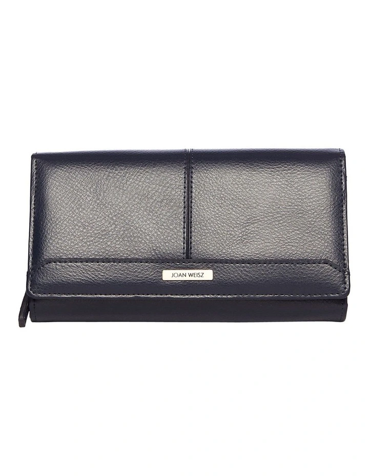 Joan Weisz Large Dakota wallet in Navy JWF044. Brushed gold hardware, Joan Weisz plaque, flap with snap closure. The wallet features separate front and back sections with 3 ID windows, 16 credit card slots, 2 bill compartments, zip around compartment, 1 zip pocket, 3 slide pockets, pen holder. Also available in Tan, Red and Black. Fabrication Leather (exterior), PU (interior) Dimensions: 19.0 W x 10.0 H x 3.5 D cm. Style JWF044
