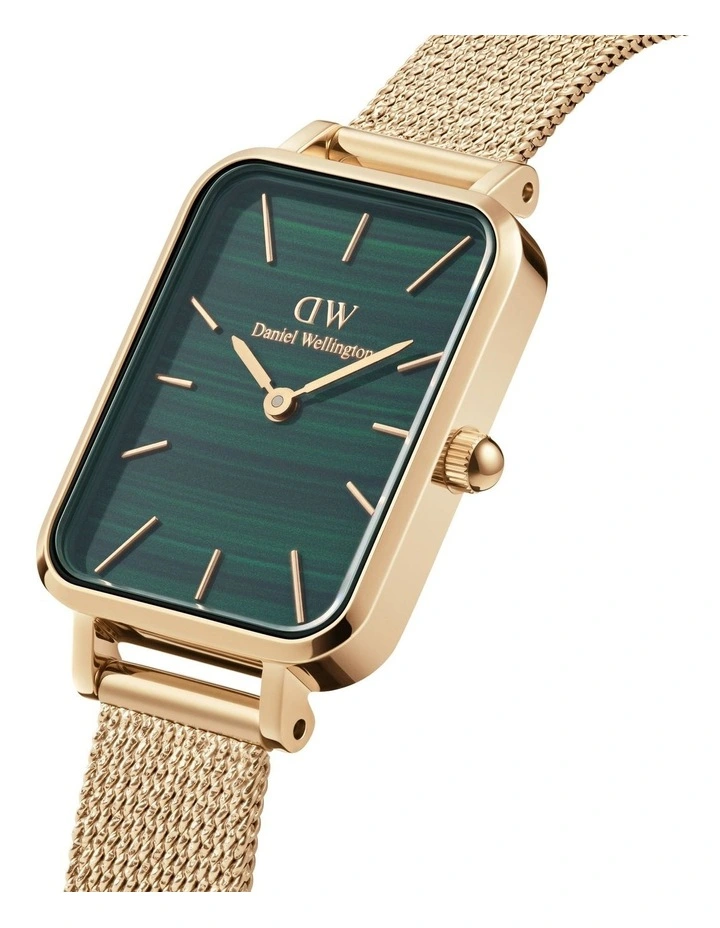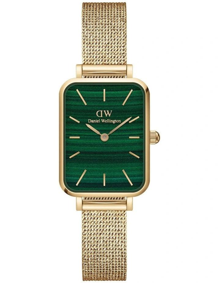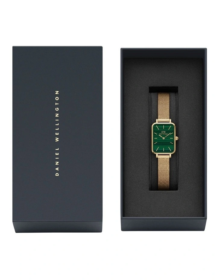 The Quadro Pressed Evergold from Daniel Wellington is beautiful from all the anglespun intended! This womens gold watch brings together our signature square, green watch face and a refined gold mesh bracelet. This is crafted from stainless steel with a gold finish, woven in a glistening fabric-like texture that feels pleasant on the wrist. So, when you want to give your look a bit of an edge, choose this timepiece or another from our collection of angular green dial watches.