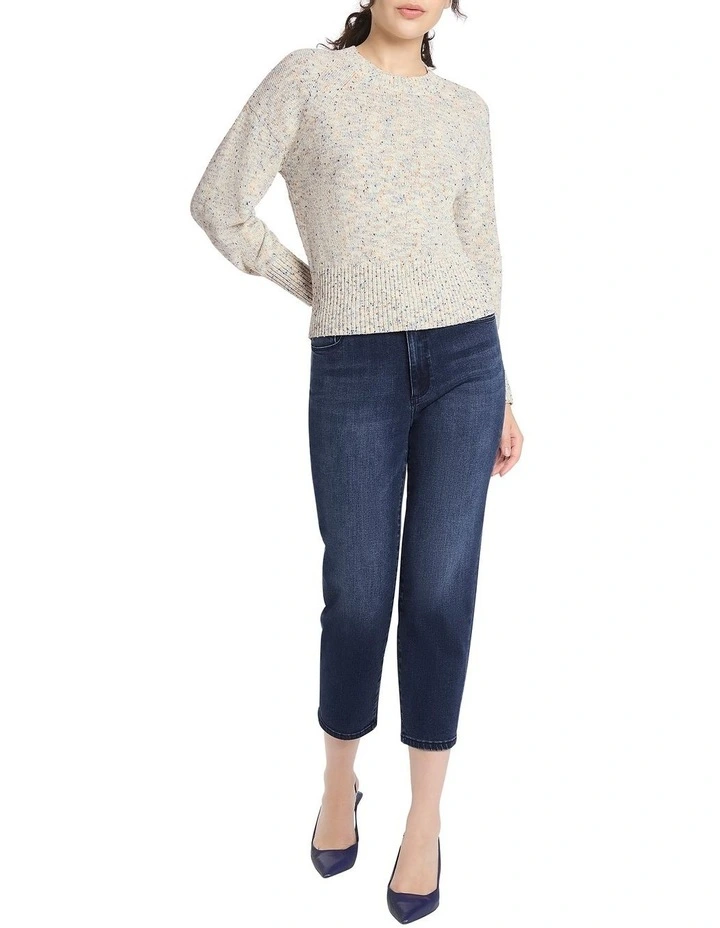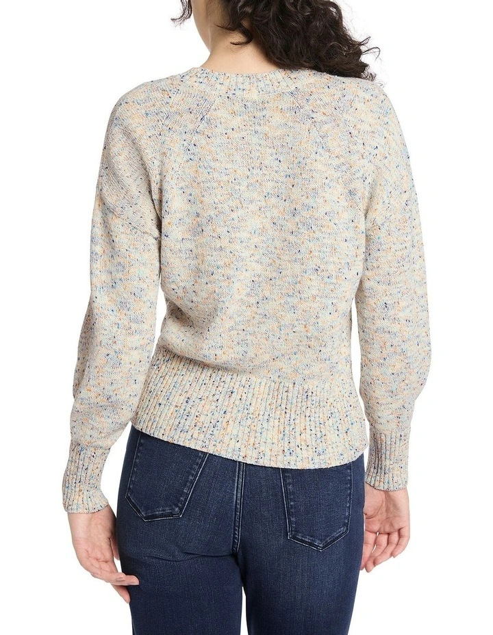 Effortlessly pairable, this long sleeve knit sweater wraps you up in a soft cotton blend, to flaunt a beautiful multi-tonal speckle set against a base of ivory. Relaxed through the body, the sweater draws in at the waist with a broad rib waistband, with further detail found at feature stitch panels at the shoulders, and soft-touch rib trim at the crew neckline and cuffs.