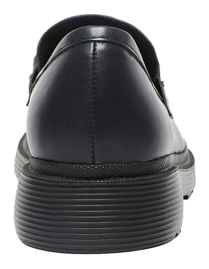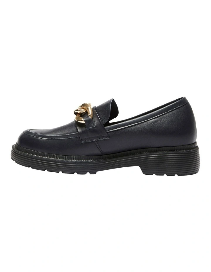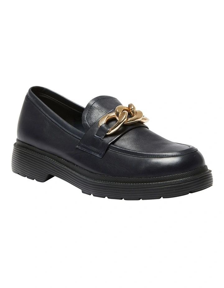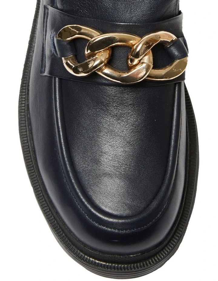 A chic wardrobe staple, ELOISE by Easy Steps combines comfort and versatility in its contemporary loafer silhouette. Elevated by gold-tone chain detailing across the penny strap, it tapers to a slender round toe and rests on a chunky layered sole. Style yours with a sweater and slip skirt for a cosy look.