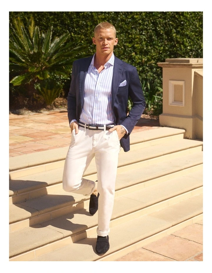 Made from GOTS-certified organic cotton and 1% elastane that has been woven in Italy into a dashing twill fabric, the Fairbanks is a dressy cotton jacket that can be paired with its matching trouser to create a handsome, lightweight suit. The elastane component adds natural stretch and give perfect for when youre on the run. The Fairbanks features a notch lapel, vintage-inspired horn buttons, working four-button surgeons cuffs, two patch pockets, while it is fully lined and with a half canvas construct to help add structure. There are additionally three internal pockets and Cupro lining with contrast white stitching. Dry clean only.