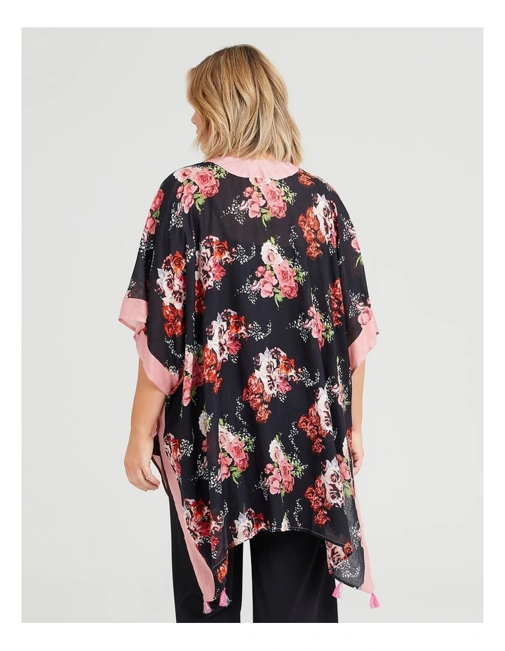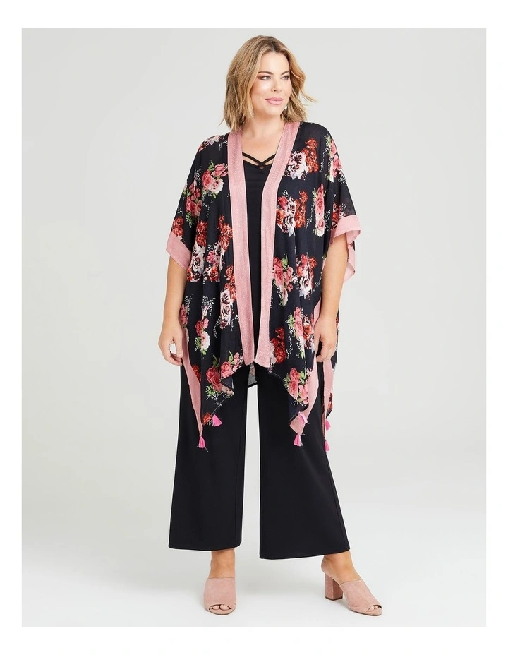 The Floral Hotfix Trim Cape is an easy, elevated layer to add a pop of colour to your wardrobe and provide that little bit of extra coverage without adding any bulk! Youll love the way the lightweight, natural viscose feels, with sleeve cut-outs and curve-flattering silhouette! This breathable plus-size cape has a soft, floaty look with open cascade front and would look great over your basic leggings and tank!