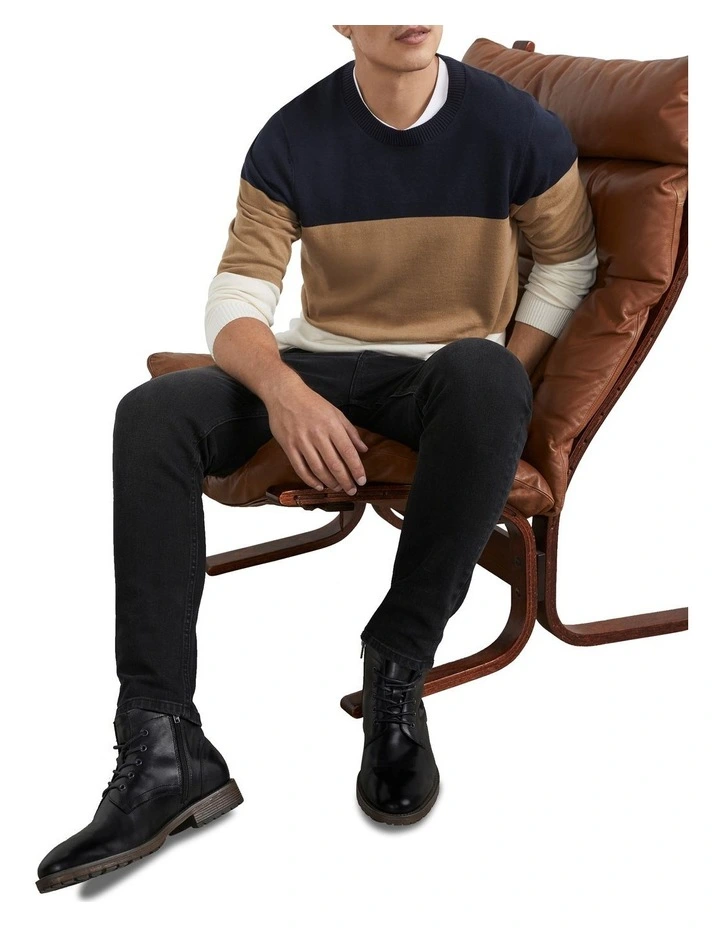 Our Block Stripe Knit is a stylish must-have for your transeasonal wardrobe. Featuring on-trend block stripes, this comfortable knit is made from lightweight cotton and offers a classic crew neck style, regular fit, long sleeves, and just the right amount of stretch. Pair with our Slim Tapered Jean and Miles Leather Boot.