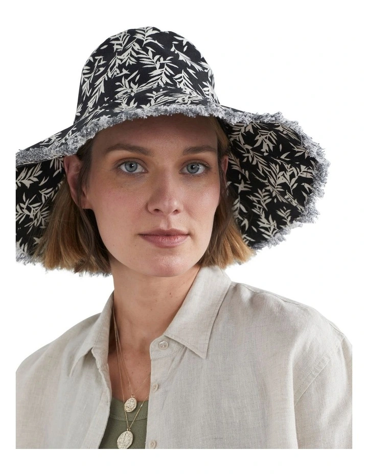 Stay sun safe and stylish with our Leaf Print Sunhat. With a wide brim for ultimate sun protection, this hat is made from 100% cotton canvas and features a fun leaf print and frayed edge detailing. Pair with our Boyfriend Shirt and Cotton Ribbed Tank.