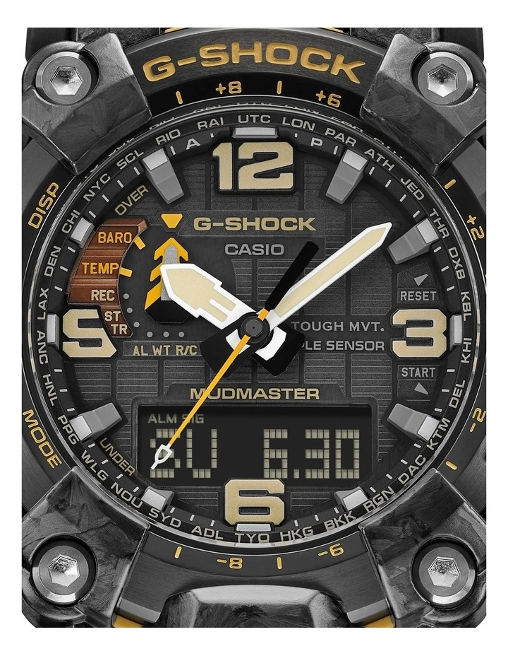 G-Shock Master of G Triple Sensor Mudmaster GWG2000-1A5 with Analogue and Digital Display, Tough Solar, Carbon Core Guard Structure, Digital Compass, Barometer, Altimeter, Thermometer, 5 Daily Alarms, Countdown Timer, 1/100-Second Stopwatch, World Time, Double LED Light with Afterglow, Neobrite, Sapphire Glass with Glare-Resistant Coating, Screw Lock Crown, Low-Temperature Resistant, Mud Resistance, Vibration Resistance, Shock Resistance and 200m Water Resistance.