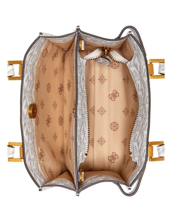 The Atene Mini Satchel from GUESS is an adorable new addition to this seasons collection. Effortlessly versatile, switch it up between a top handle and adjustable strap. Stone vegan leather boasts a luxurious logo design, and can be styled like all your favorite neutrals