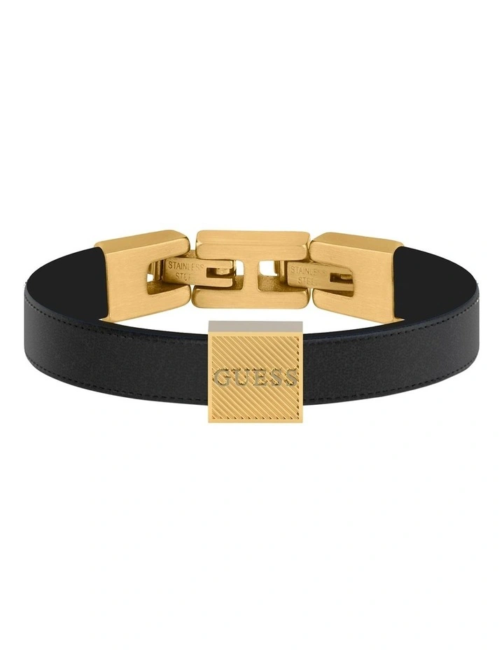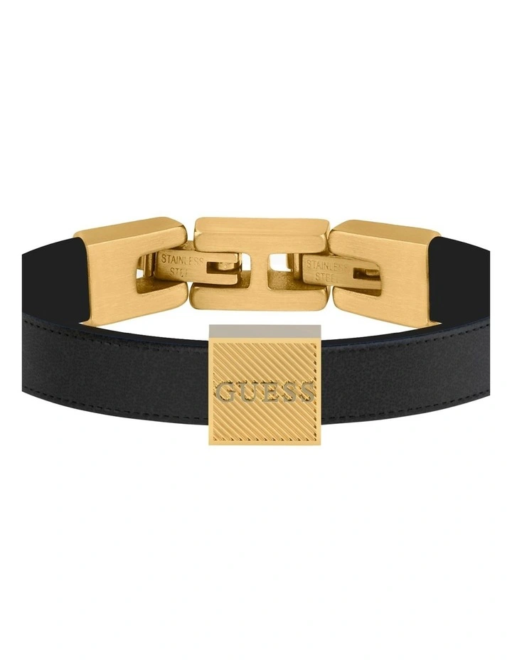 This 10mm bracelet from GUESS features a black PU bracelet with gold tone logo plate and gold tone stainless steel jewellery closure that adds an easy layer of style to any outfit.Â