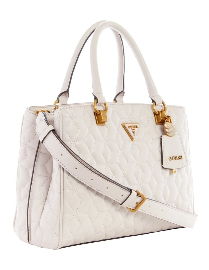 The Elenia Girlfriend Satchel from GUESS is a piece that doesn’t compromise when it comes to time-honoured style. With its quilted PU texture, bold bronze hardware, detachable shoulder strap and tasteful clochette accessory, this stone satchel brings a hint of luxury into each and every day.