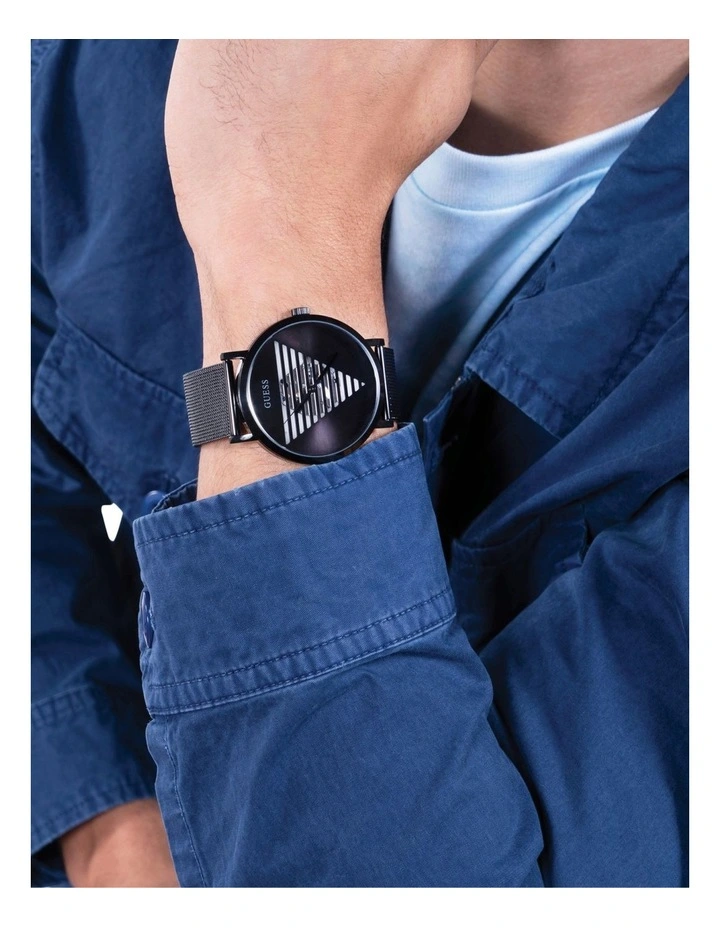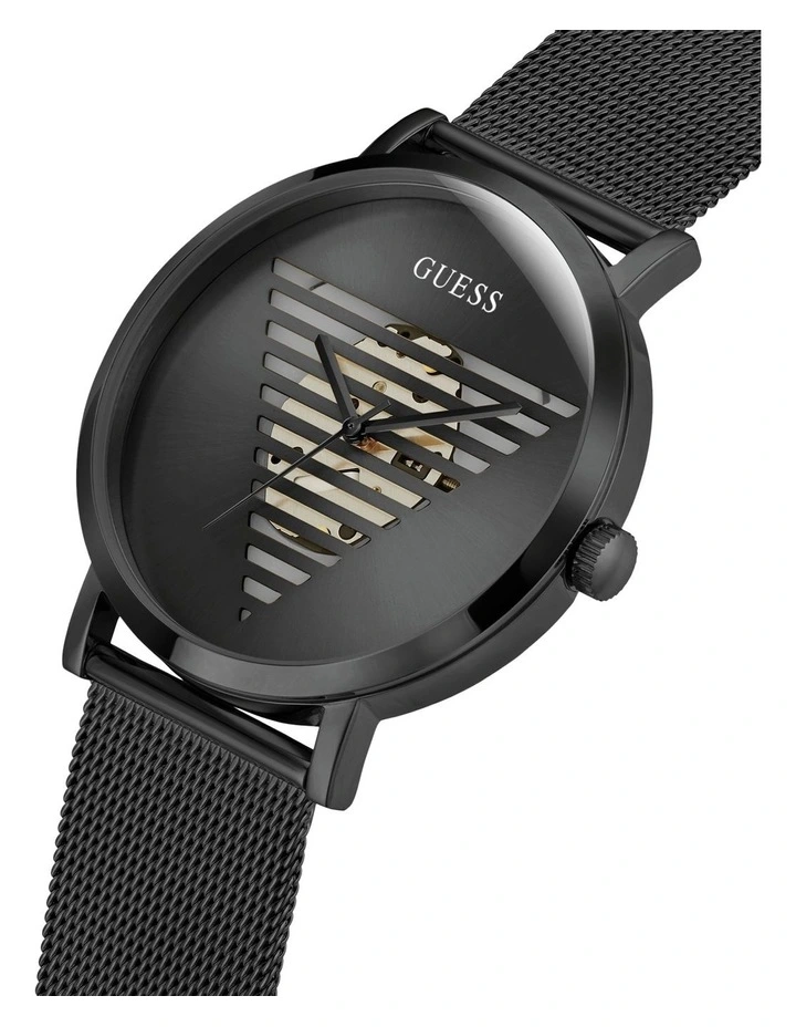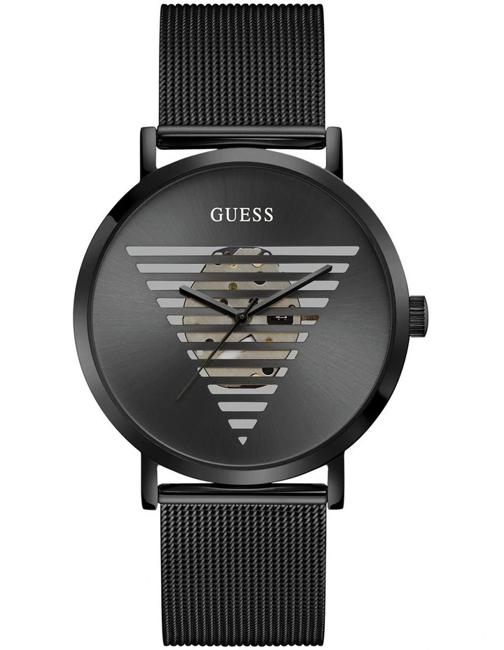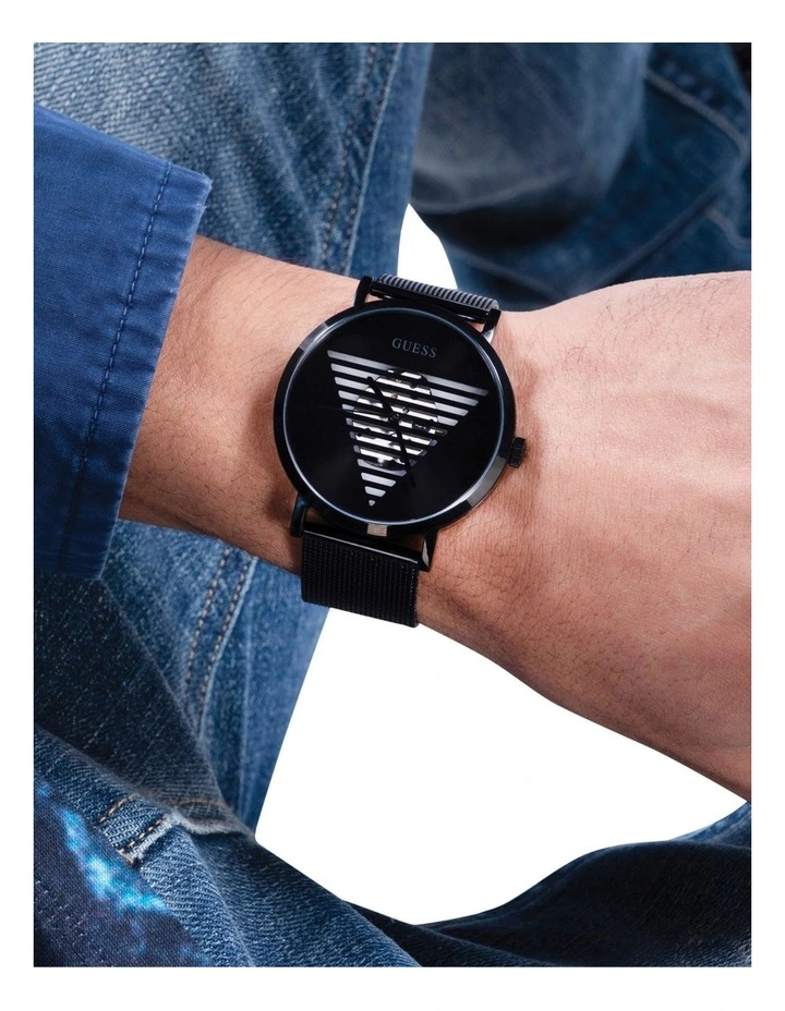 Meet the new signature icon for our GUESS guy. This easy-wearing 44mm black stainless steel case features a cut-out triangle motif at the centre of the black sunray dial, exposing the inner workings of the watch and an authentic brand aesthetic. Finished with a black stainless steel mesh strap, this piece is perfect for every occasion.