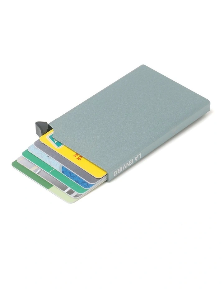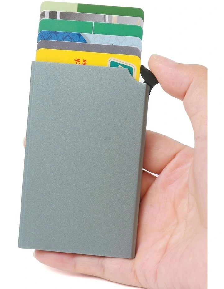 This minimalist, RFID-blocking cardholder with a special top pop-up button to quick access cards, it is made of a sturdy aluminum shell to prevent IDs and credit cards from being squeezed.