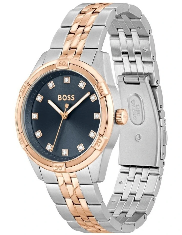 The essence of sporty-chic style, the BOSS Rhea is a refined three-hand timepiece that reflects the innate confidence of the BOSS woman in a clean and modern design. Distinctive details draw the eye to the wrist: a three-dimensional, brushed and polished bezel with second stations, a logo-etched reflector ring, and squared indexes with round crystals. Fitted with a smooth leather strap or link bracelet, the Rhea complements any outfit and can be effortlessly dialed up or down with jewelry.