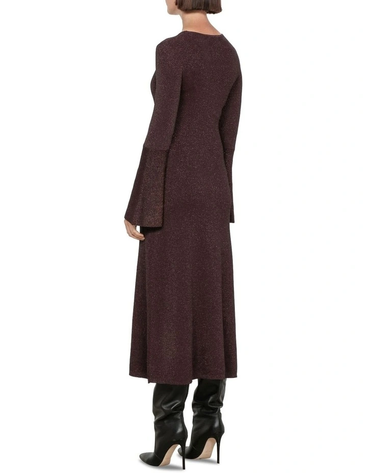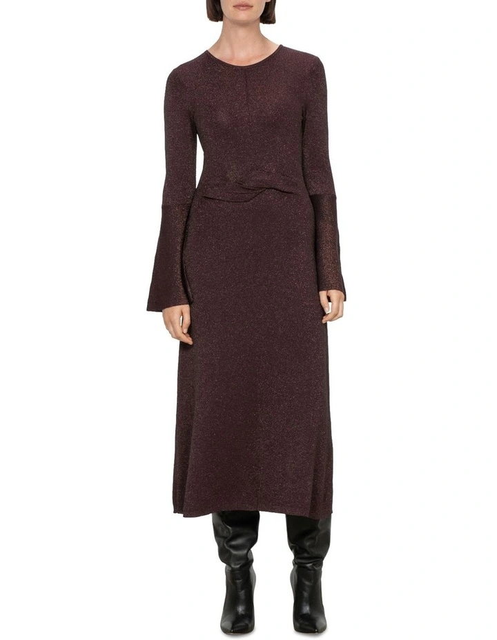 Make a statement in this luxurious knit dress. Composed from a lurex blend yarn, this knit dress will become the highlight piece of your wardrobe. Defined by a unique twist detail at the waist and flared sleeves for a contemporary touch. Style with your favourite pair of boots for the perfect autumnal look.