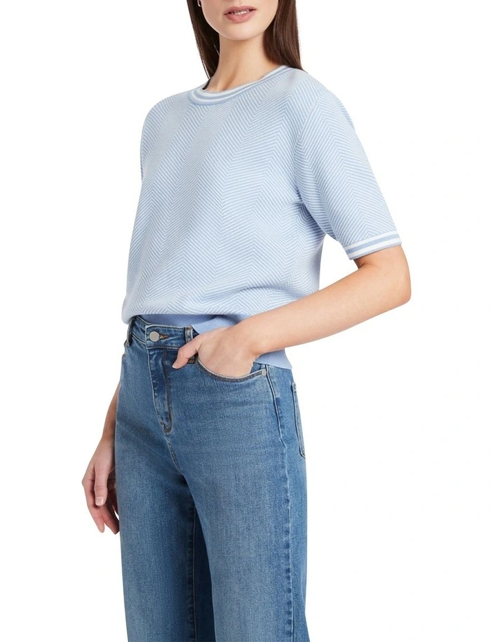 Pairing Maya blue with ivory, this short sleeve knit top shows off a neat chevron design at the body and sleeve, accentuated by rib stripe detailing at the neck and cuffs and solid blue rib at the body hem. Soft against the skin in pure cotton yarn, the top creates a relaxed, boxy fit with round shaping through the neckline and straight shaping at the hem.