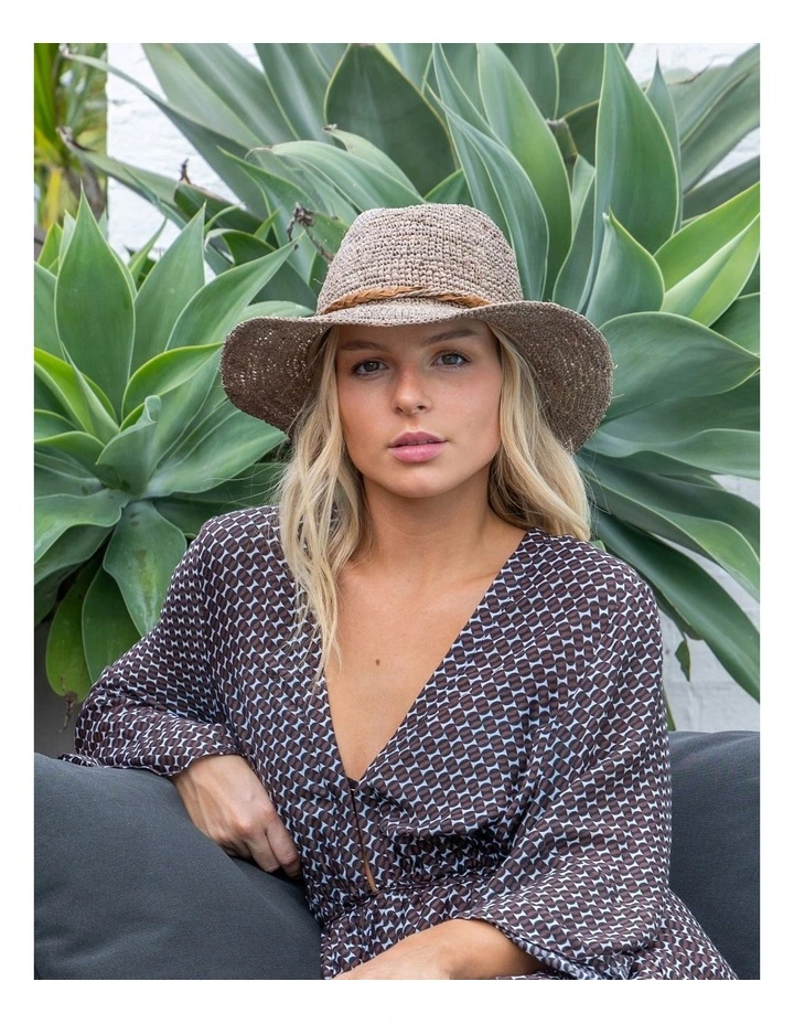 Made for long summer days strolling along the beach or at the markets, this Cowboy hat is made of fine crocheted raffia with Japanese wire in the brim and features a tear drop crown that is surrounded by a twisted raffia and suede string.