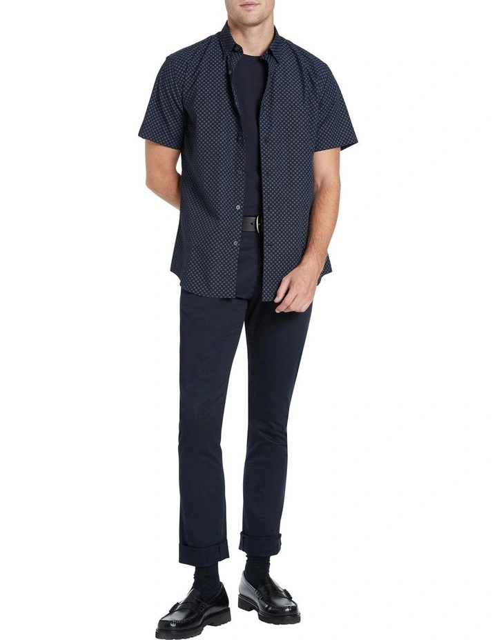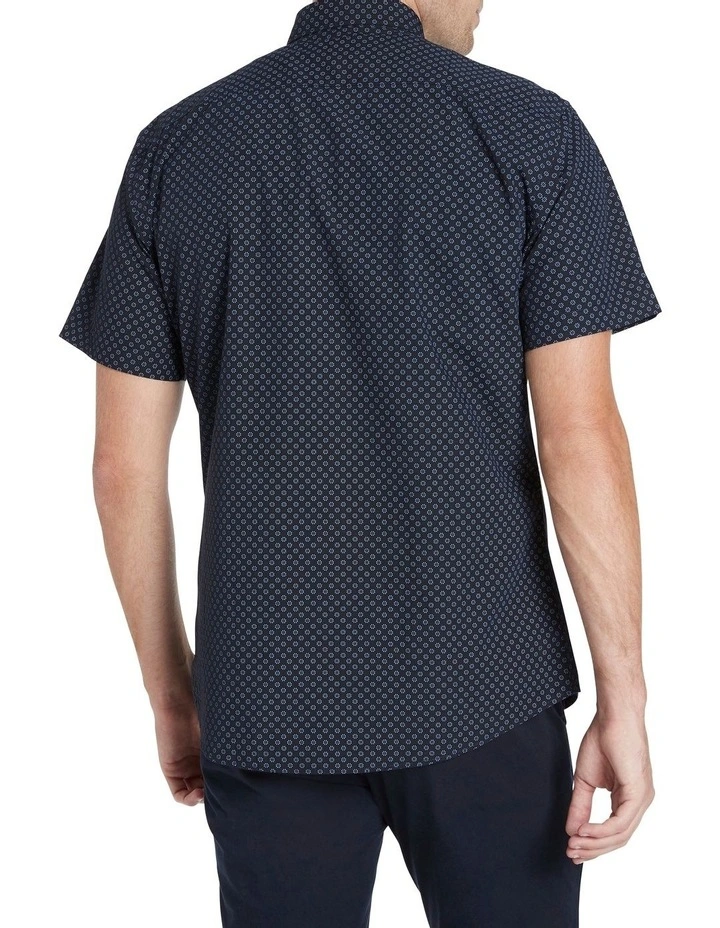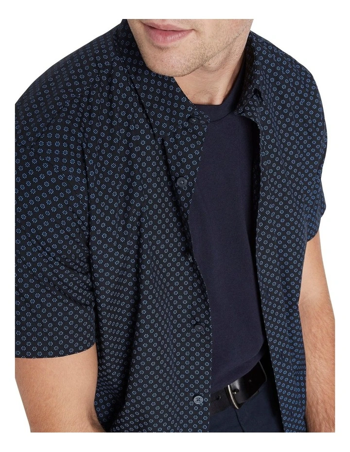 Lightweight and comfortable in pure cotton, this short sleeve shirt reveals a deep black colouring with an pale blue, geometric floral print. Fastening at the front with matching black buttons, the shirt creates an effortless, regular fit and is completed by a classic shirt collar, and curved shaping at the hem.