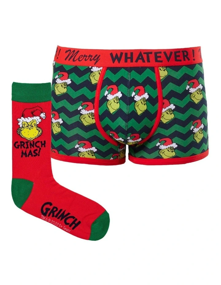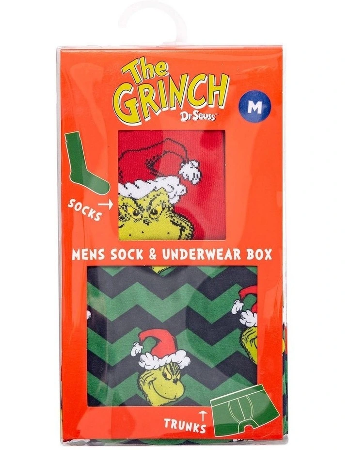 Add a smile to your style with these officially licensed Dr Suess Grinch Grinchmas Trunks and Sock Gift Pack. This fun pack contains our favourite trunk shape with 95% Cotton/5% Elastane fabric, contrast bind at pouch and leg opening and a super soft waistband with logo delivering comfort where it counts. Plus, our fun original design socks with a contrast colour toe, heel and double ribbed cuff. This pack is the perfect gift for any Grinch fan!