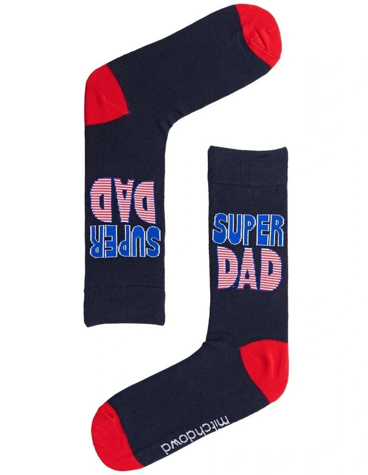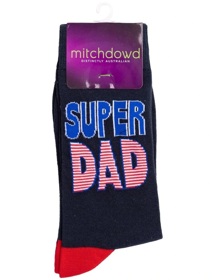 Look stylish in these fun Mitch Dowd Men’s crew socks featuring a placement Super Dad design, and contrast colour toe, heel and double ribbed cuff. Great for everyday wear or the perfect gift idea.
