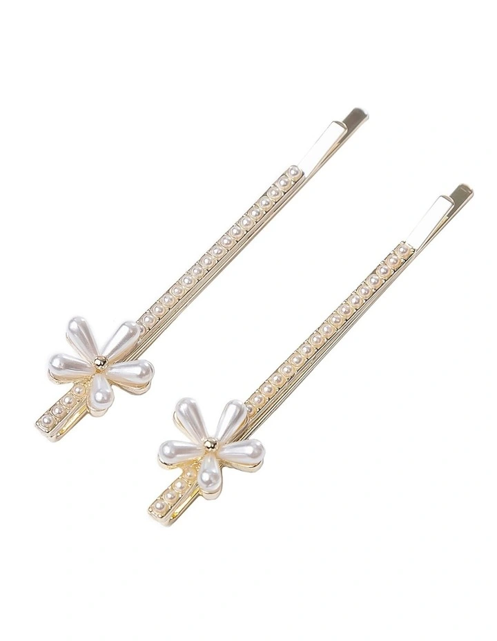 Straight bobby pins featuring a single row of micro faux pearls with a daisy look flower. A must have addition to so many different looks.