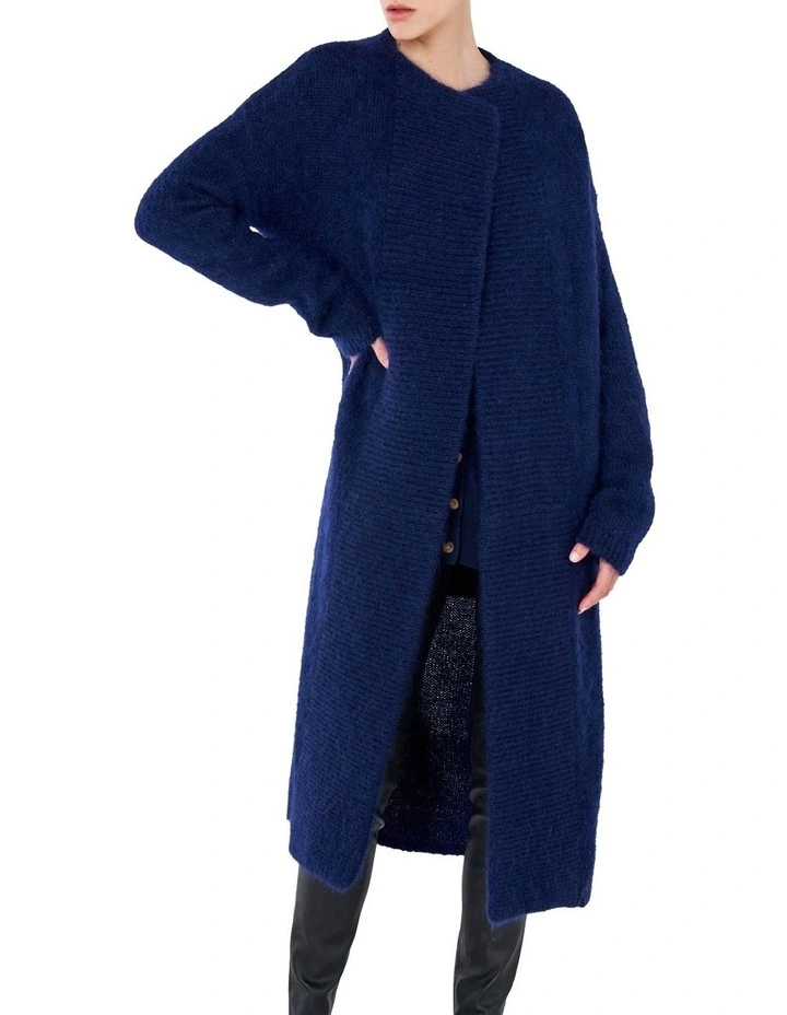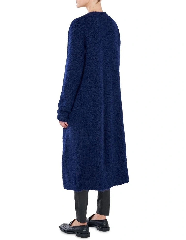 Our Mohair Longline Cardigan made from a luxurious responsibly sourced natural fiber wool & mohair yarn. Our Mohair yarn is the fleece of the Angora goat, is one of the worlds most beautiful and exclusive natural fibers with an unrivaled softness and lustre. This Longline Cardigan is an easy addition to your winter outerwear collection and will elevate your wardrobe. A long line relaxed fit with a highlight heavy rib finish at front opening and body hem.