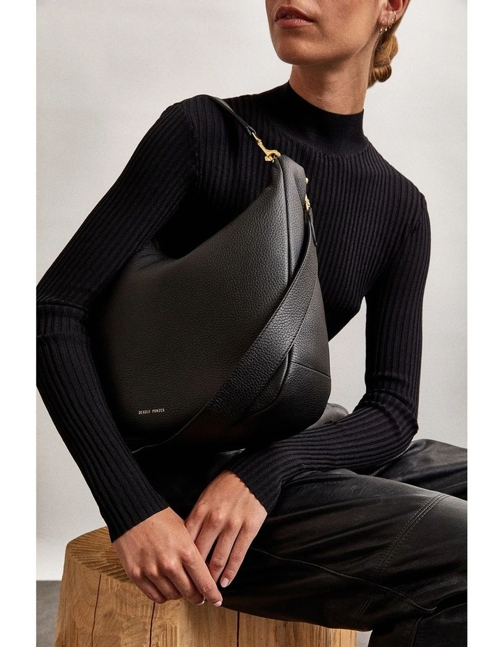 Deadly Ponies’ Mr Sling is shapely, sumptuous and sure to sell out. Mr Sling will hold all of your daily necessities and then some, with his internal slip pockets. Made from our long-wearing Deer Nappa leather, wear him on the shoulder with the detachable top handle or across the body with the additional shoulder strap. Versatility and size makes Mr Sling a modern day Deadly Ponies classic.