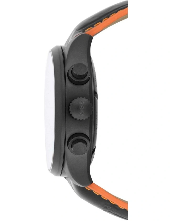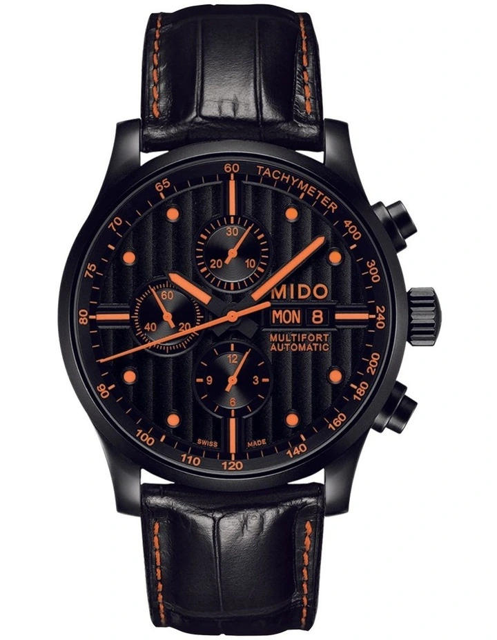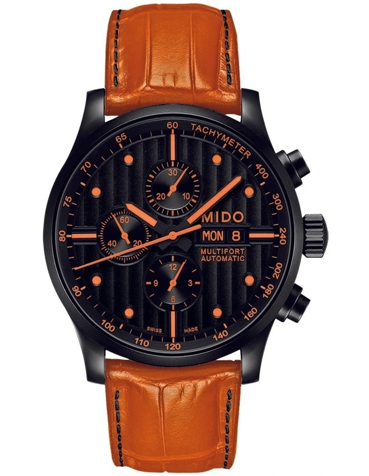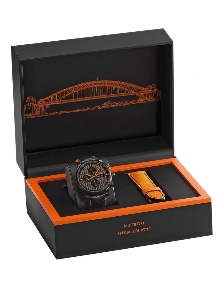 The Chronograph Special Edition Multifort watch has a very strong look thanks to its three counters, black dial and orange appliques and hands. The automatic chronograph movement adds to this sporty identity. It is sold with interchangeable black and orange straps.