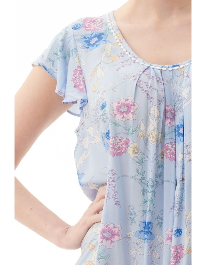 Light soft and cool, this beautiful print short nightie is lovely to wear on warm summer nights. The front neckline has 5 pleats providing comfort. Sweet bobble trim under the self binding, and soft flutter sleeves.