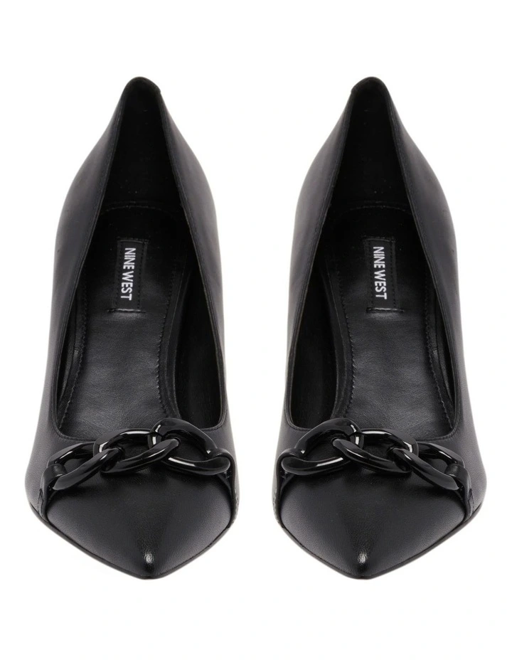 The Nine West Jezzie is set on a mid block heel with a classic pointed toe. Defined by its elegant silhouette and modern chain detailing across the vamp giving a sophisticated yet chic style choice. Ideal for pulling together an office-appropriate outfit.