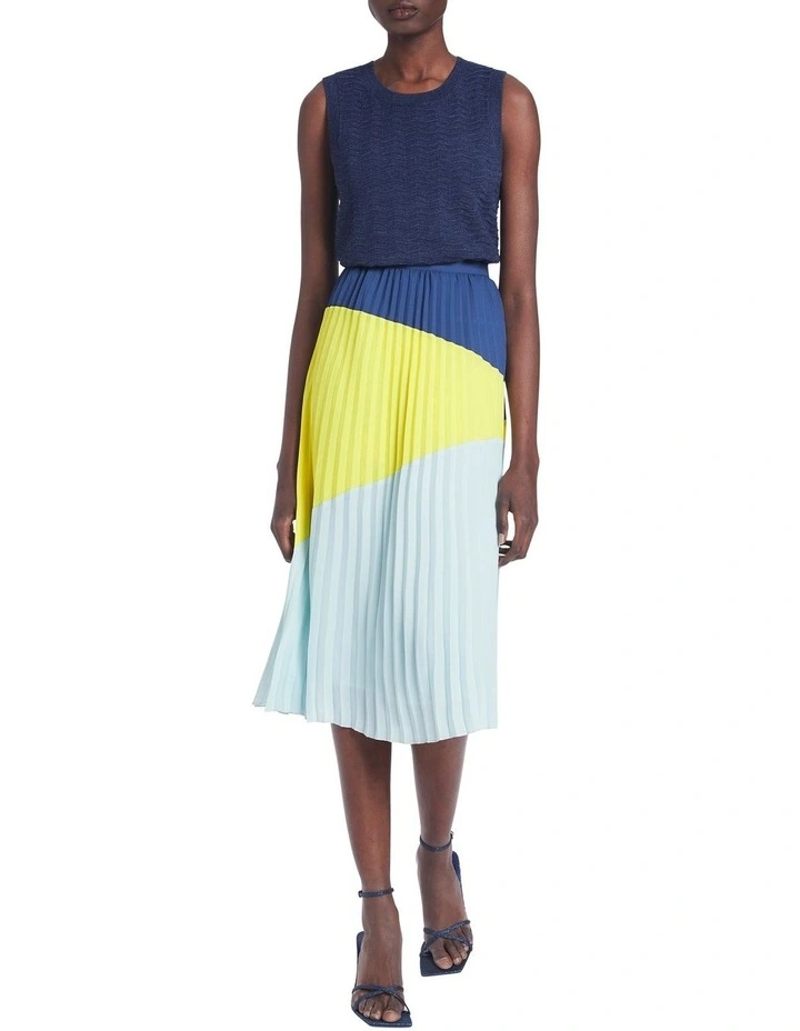 Creating a lightweight look in rich denim blue, this knit top feels soft to the touch within its textured zig-zag design, perfectly accentuated by fine rib trim detailing at the neck, armholes and body hem. Made from a wool-blend yarn, the top shows off a slim fit within a sleeveless design, allowing for effortless pairability within your wardrobe.
