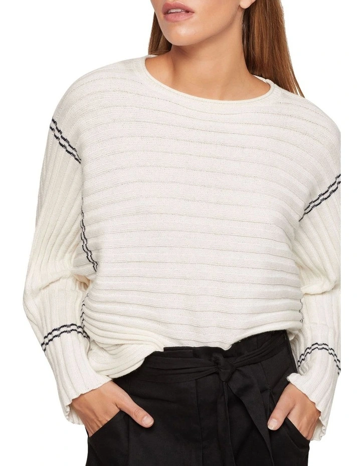 For a relaxed yet stylish look, add the Lizzie Rib Knitted Pullover to your wardrobe. This relaxed fit jumper is crafted from a soft cotton blend in a wide ribbed knit in a horizontal pattern. It has a drapey design with wide sleeves and a loose fit with natural hems and contrast stripe detail through the cuffs and shoulders. Wear it with some paperbag pants and loafers for an effortless look.