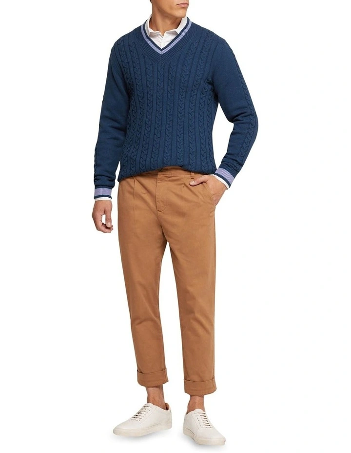 Vintage cool, the Logan Cricket Knit Pullover is a timeless look. This regular-fit jumper is crafted from 100% organic cotton in a knitted weave. It features a classic cable knit pattern, a v neckline and contrast trims on the neckline and cuffs. Wear it with chinos and sneakers for a dapper off-duty look.