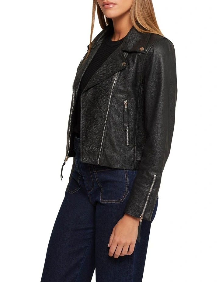 The Sandy Textured Leather Jacket is a durable and versatile piece with rock n roll attitude. This iconic design has a textured finish and is cut with a cropped length. It features metallic zips, press studs, wide lapels and is fully lined. It is crafted from 100% vegetable-tanned leather; a process that replaces chemicals with natural ingredients, improving its environmental impact while maintaining the quality we know and love from leather. Team it with a knitted top and flared jeans for a versatile look.