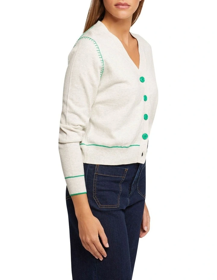 Luxe fabric and cute style, the Zandy Tipping Detail Cardigan will be a fast favourite. This light knit is crafted from a blend of cotton, wool and cashmere with a relaxed fit and cropped length. It features subtle contrast tipping detail, tortoiseshell buttons and ribbed trims. Wear it with some wide-leg pants in a complementary colourway and crisp white sneakers.