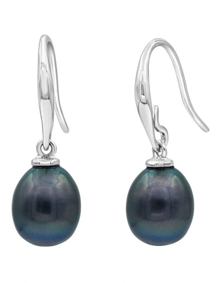 - Iridescent Peacock Black Drop Cultured Freshwater Pearl Polished Sterling Silver Hook Earrings.