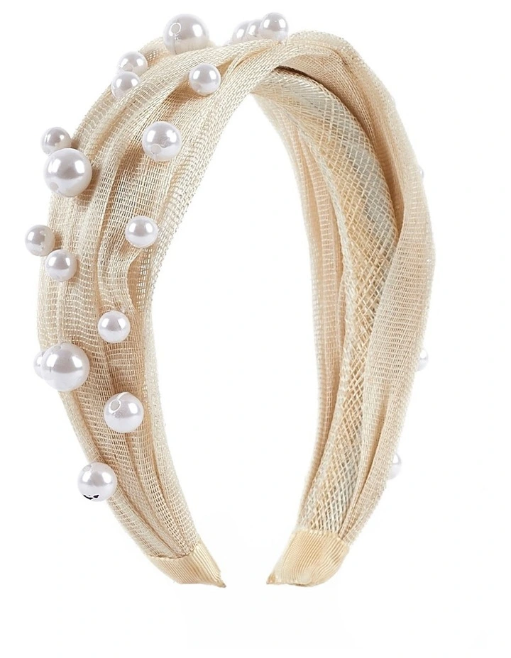 An easy to wear sinamay headband featuring matching pearl look beads.